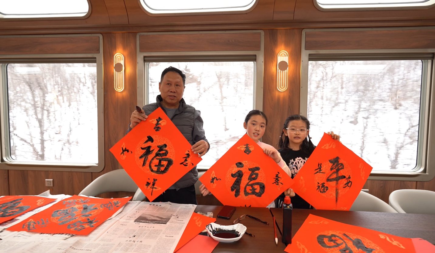 游客們自己動(dòng)手寫(xiě)春聯(lián),在列車(chē)上過(guò)一個(gè)別樣春節(jié)